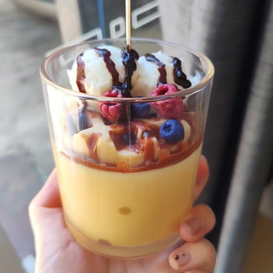 A nostalgic throwback to neon lights, mixtapes, and late-night diner runs. 80's Golden Waffle Stack captures that warm, cozy moment of a fresh waffle stack dripping with sweetness. Styled like an 80's breakfast treat and scented with a rich Waffle Cone Vanilla fragrance, it’s comfort in candle form.