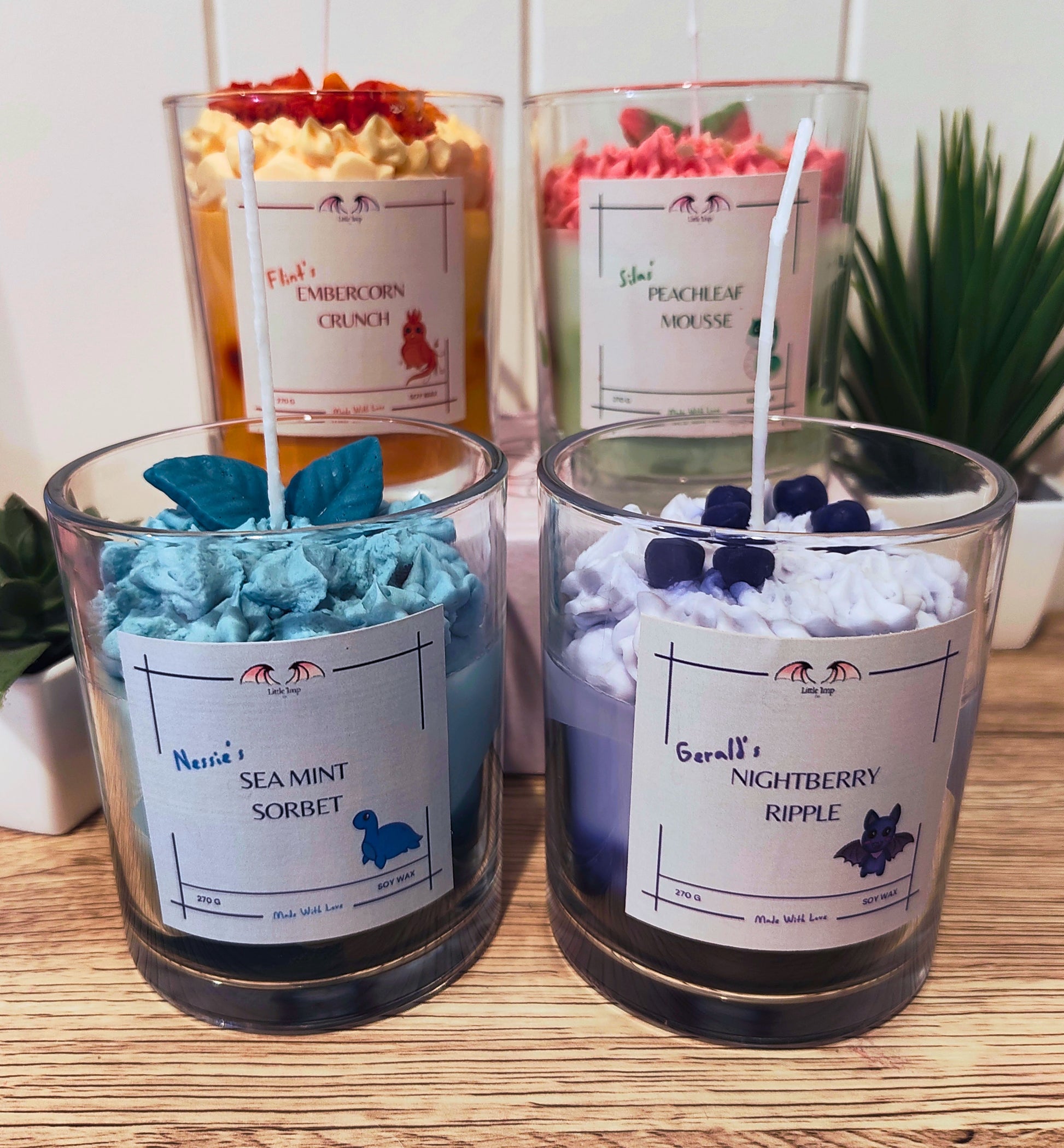 Each set includes four handmade 270g soy wax candles, styled like whimsical desserts and scented to match their creature’s personality.