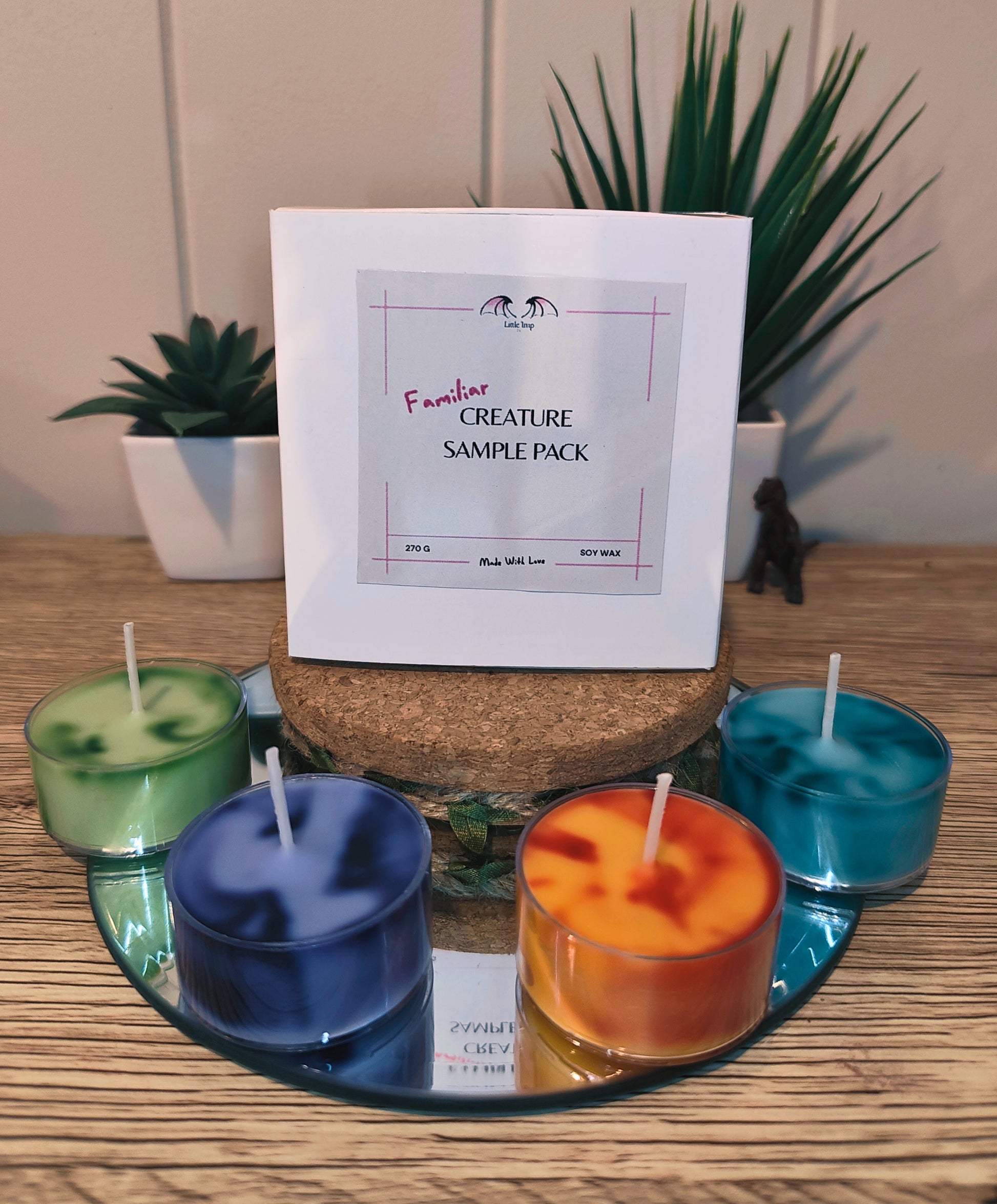 Try the whole collection in bite-sized form. Each bundle includes four hand-poured soy wax tealights, styled with the same whimsical dessert-inspired scents as their larger candle counterparts—perfect for sampling or gifting.